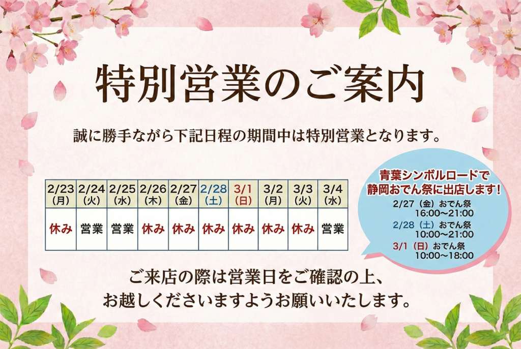 いつも当店をご利用いただきまして誠にありがとうございます。誠に勝手ながら下記の期間は、一部日程で通常と異なる営業となります。ご不便をおかけいたしますが、ご来店の際は営業日をご確認のうえお越しください。